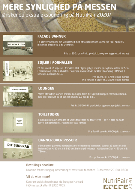 Vil du have ekstra eksponering af din deltagelse på NutriFair 2020? Vil du blive set og sikre endnu flere besøg på din stand? Se mere om dine muligheder for ekstra eksponering i arket her eller kontakt os for vejledning.